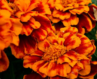It's mostly orange and yellow tagetes and chrysanthemum that are still in bloom around the yard, which emphasizes the autumn colours rather than add to the in places still present, but subdued and sparse, rainbow of summer flowers. Sure, there's still rose and red fuchsias, pink hollyhocks and purple clematis, but it's the orange flower that you see the most of.