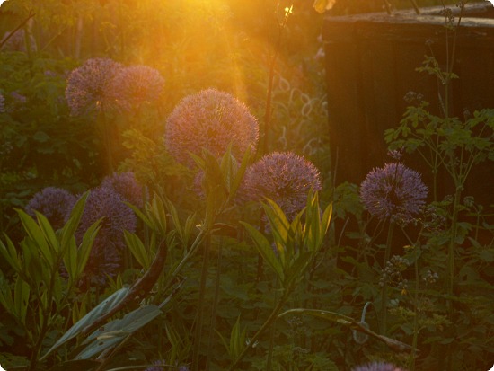Must say I really like the mix of allium flowers and bush leaves here.The sunshine is just icing on the cake, but what an icing.